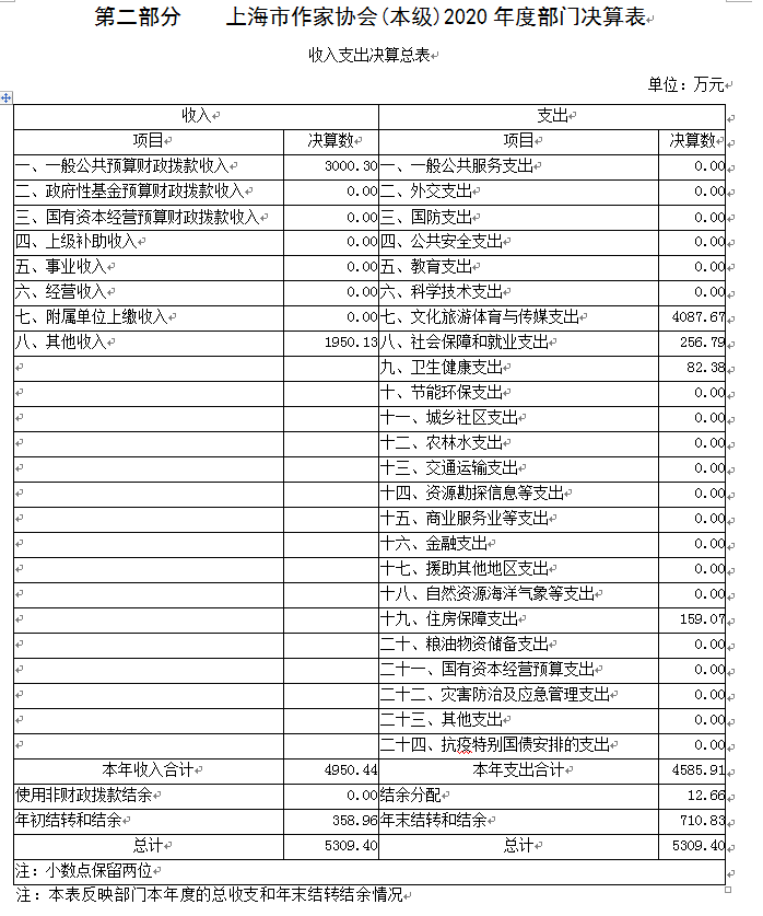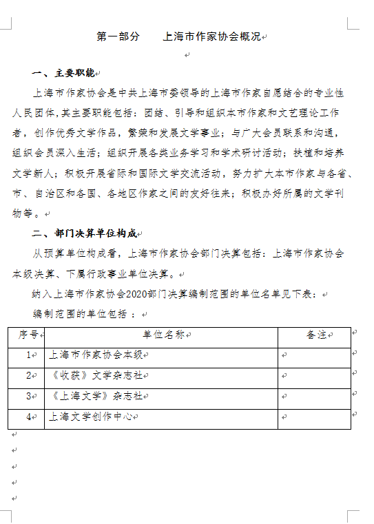 目錄 第一部分 上海市作家協會(本級)概況 一、主要職能 二、機構設置 第二部分 上海市作家協會(本級)2020年度部門決算表 一、收入支出決算總表......