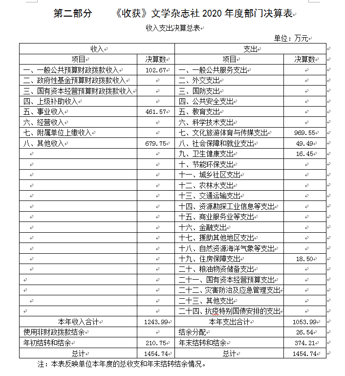 目 錄 第一部分 《收獲》文學雜志社概況 一、主要職能 二、機構設置 第二部分 《收獲》文學雜志社2020年度決算表 一、收入支出決算總表 二、收......