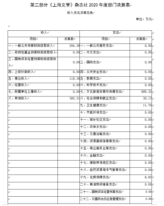 目錄 第一部分 《上海文學》雜志社 概況 一、主要職能 二、機構設置 第二部分《上海文學》雜志社2020年度部門決算表 一、收入支出決算總表 二......