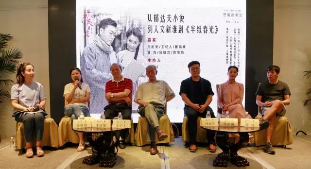 從左至右為章聆軒、管燕草、毛時安、王紀人、陸曉龍、陳麗娟、譚昀 思南讀書會第192期活動現場,取材于郁達夫短篇小說《春風沉醉的晚上》和《薄奠》的人文新淮劇《半紙春光》與讀者近距離接觸。主創人員管燕草、譚昀、陸曉龍、......
