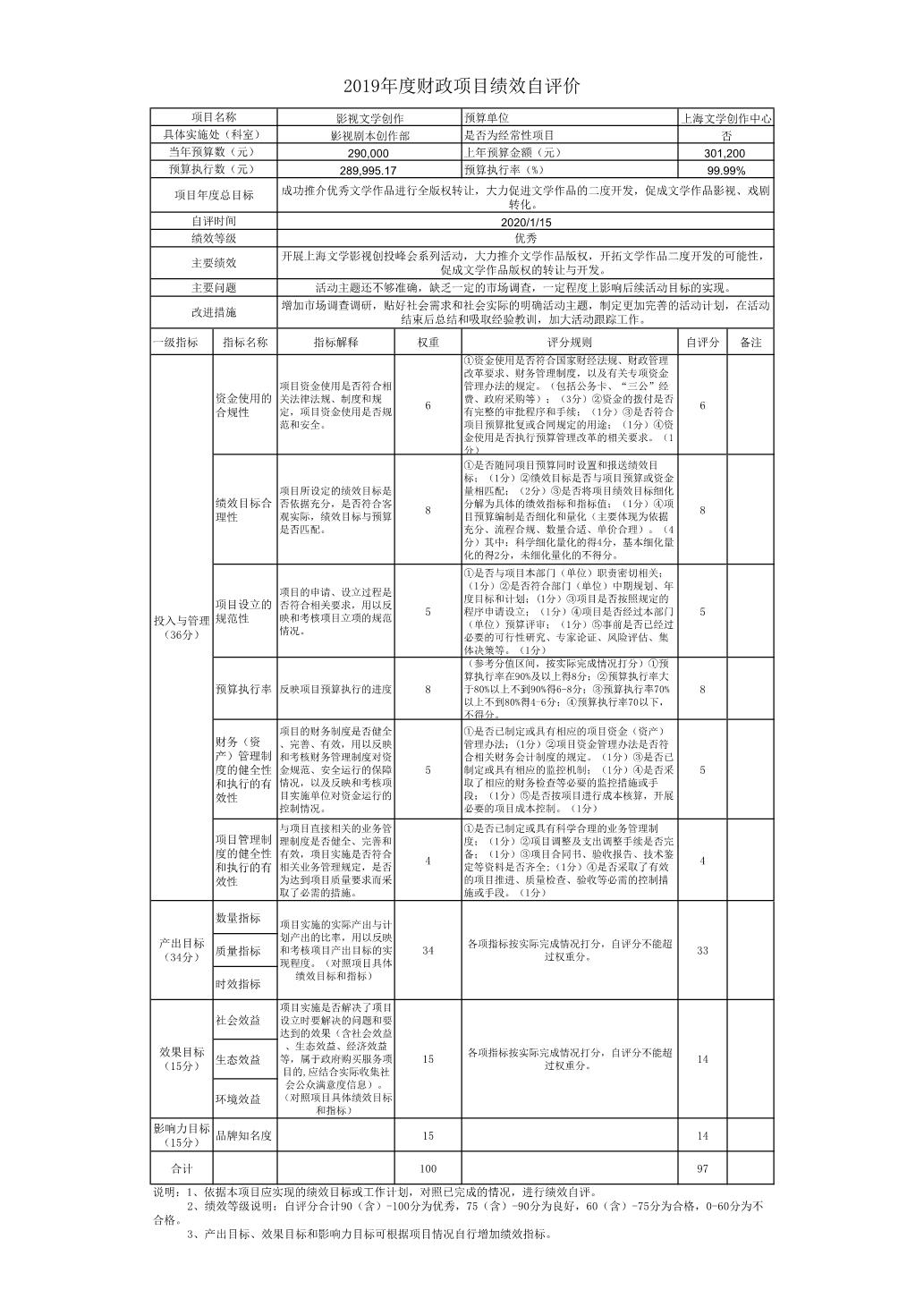 上海文創中心2019年度項目績效自評表