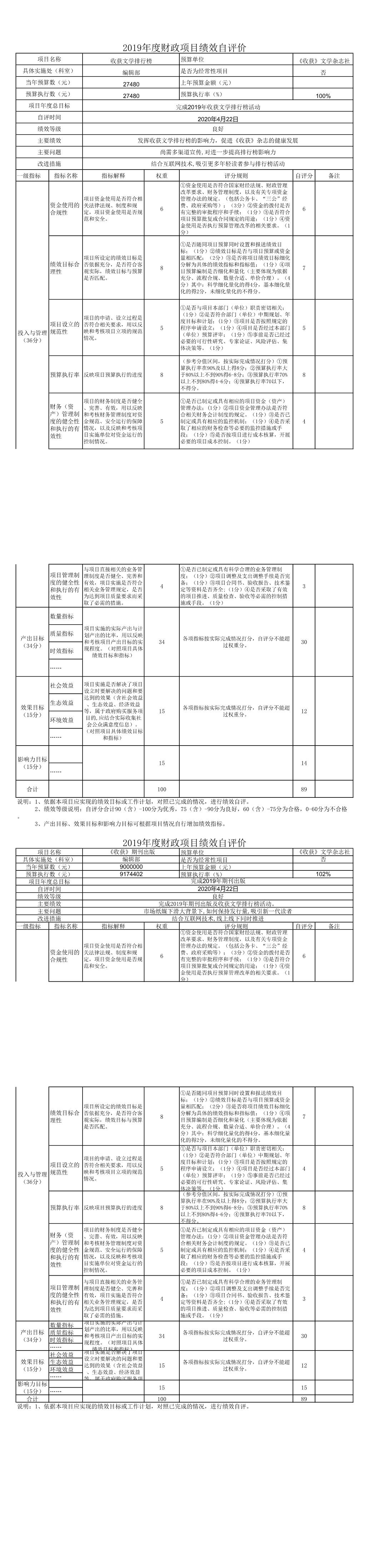 《收獲》雜志社2019年度項目績效自評表