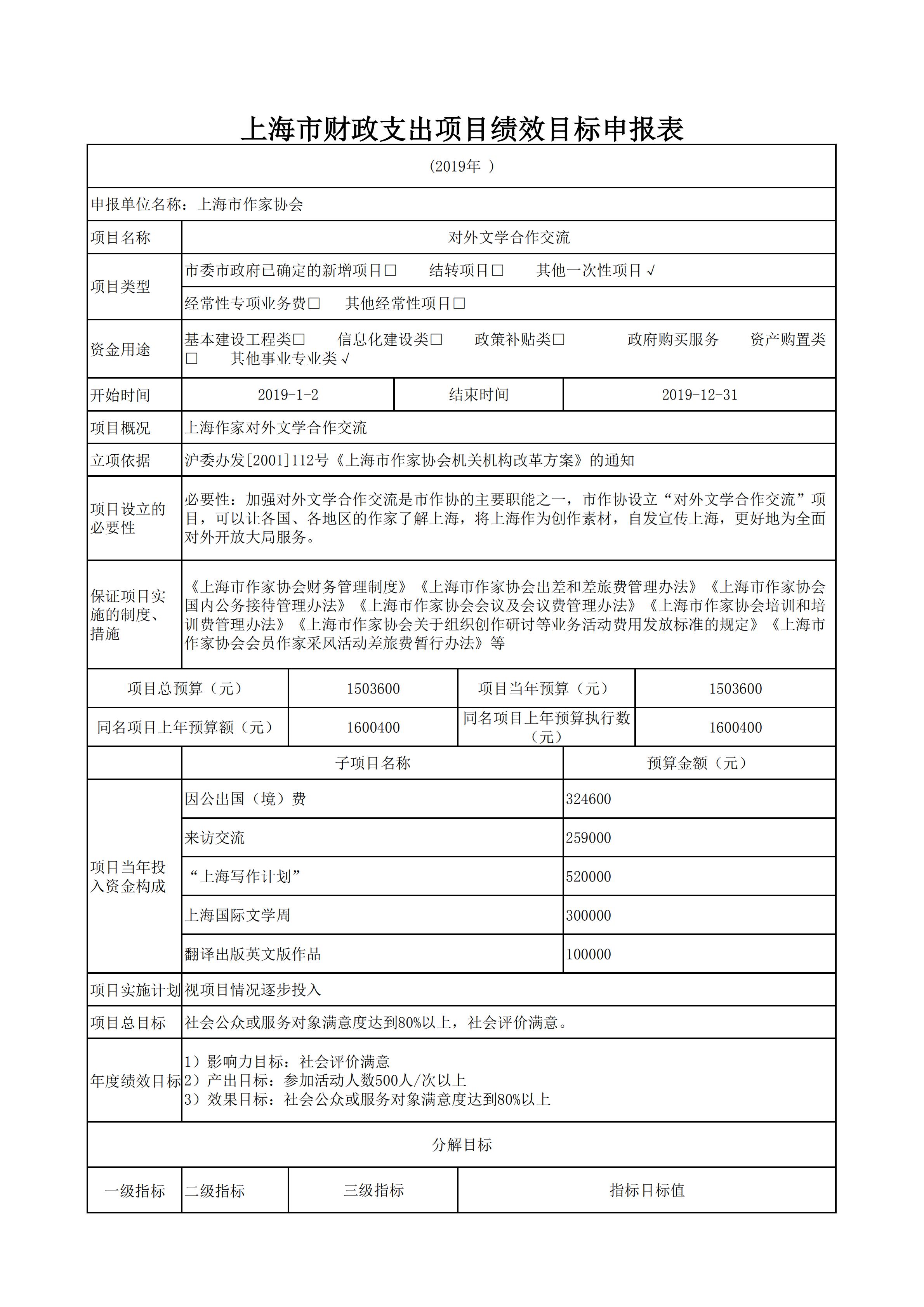上海市作家協(xié)會(huì)2019年度財(cái)政支出項(xiàng)目績(jī)效目標(biāo)