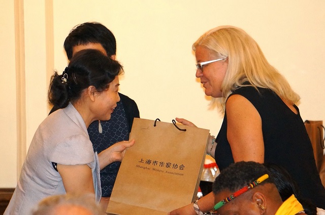 (圖為上海作協黨組書記、副主席汪瀾向駐市作家贈送上海作家作品集英譯本叢書)