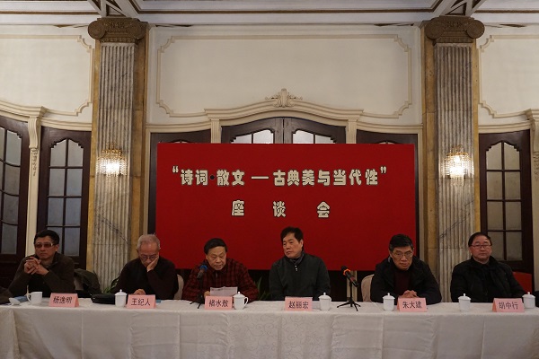 由上海詩詞學(xué)會和上海市作協(xié)理論研究室共同主辦的“詩詞·散文——古典美與當(dāng)代性”座談會于2015年11月28日在上海作協(xié)舉行。上海作協(xié)副主席趙麗宏,上海詩詞學(xué)會會長褚水敖,王紀(jì)人、朱大建、吳歡章、季振邦、楊斌華、陸梅、楊逸明、胡曉軍、胡中行、孫琴安、朱蕊、楊秀麗、王琪森、龔靜等二十多位古體詩人和新詩人、散文家、評論家出席。