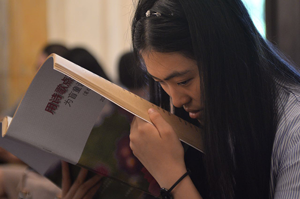 6月3日,上海市民詩歌節 “詩意上海詩歌月”以一場特殊的讀詩活動“用詩歌點亮未來——為盲童讀首詩”開場。臺下聽眾中有一半都是盲童學校的學生。