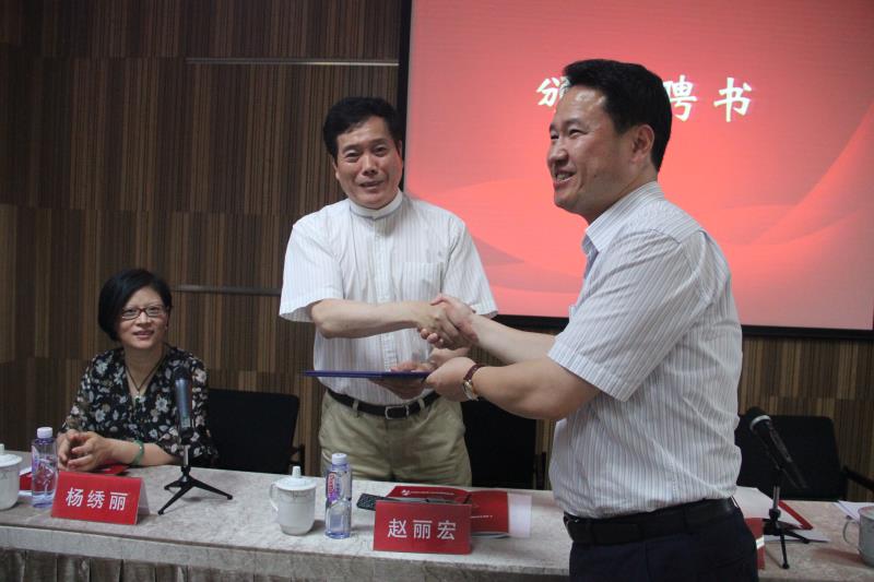 ▲上海作協副主席趙麗宏(左)與中共普陀區委常委、宣傳部部長郝柄權(右)