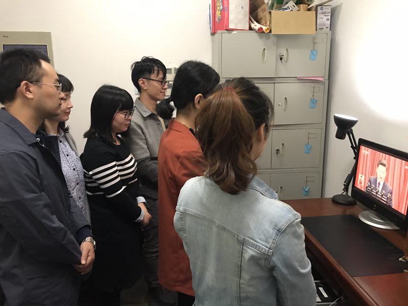 ▲上海作協(xié)機關黨員在作協(xié)大廳收看十九大開幕式