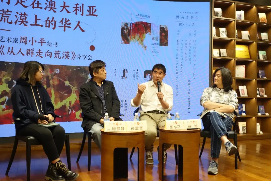 10月21日下午,藝術家周小平攜其新書《從人群走向荒漠》做客思南讀書會第432期,與著名詩人、旅行家韓博,文學評論家孫孟晉一起講述澳大利亞荒漠中原住民的藝術與生活以及一個華人如何找到心靈家園的故事。浙江文藝出版社編輯睢靜靜擔任主持。