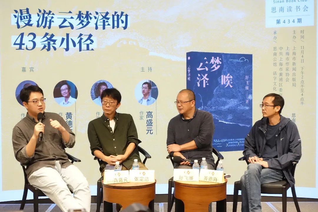 2023年11月4日,張定浩、黃德海、舒飛廉做客思南文學(xué)之家,第434期思南讀書會如期展開。本次對談由高盛元主持,以“漫游云夢澤的43條小徑”為主題,從舒飛廉新書《云夢澤唉》開始談起,給讀者們帶來了一場緊緊圍繞“鄉(xiāng)土”的新書分享會。