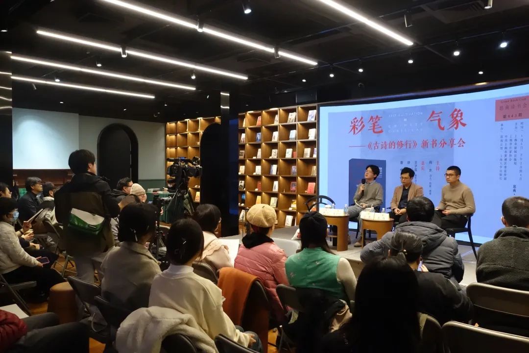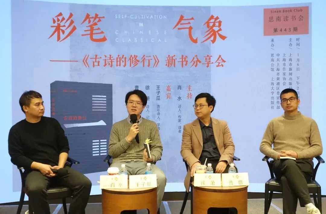 2024年1月6日,肖水、王子瓜、徐蕭、曹僧做客復興中路505號思南文學之家,共同帶來新書《古詩的修行》的分享。這本新書收錄了八位當代詩人對八位古代詩人詩篇閱讀的心得,當天到場的四位正是其中的四位作者,正如肖水所言“這本新書是我們友誼的見證,也是我們想法的凝結?!北敬畏窒碛尚に鞒?。