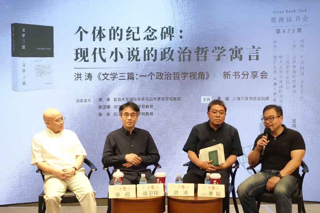 9月28日下午,復旦大學國際關系與公共事務學院教授洪濤攜新書《文學三篇:一個政治哲學視角》與同濟大學人文學院教授徐衛翔、同濟大學人文學院教授張閎、上海三聯書店總編輯黃韜一起做客思南讀書會第473期,從文學、政治學、哲學三方面入手,探討小說形式對現代社會個體探索的巨大意義。