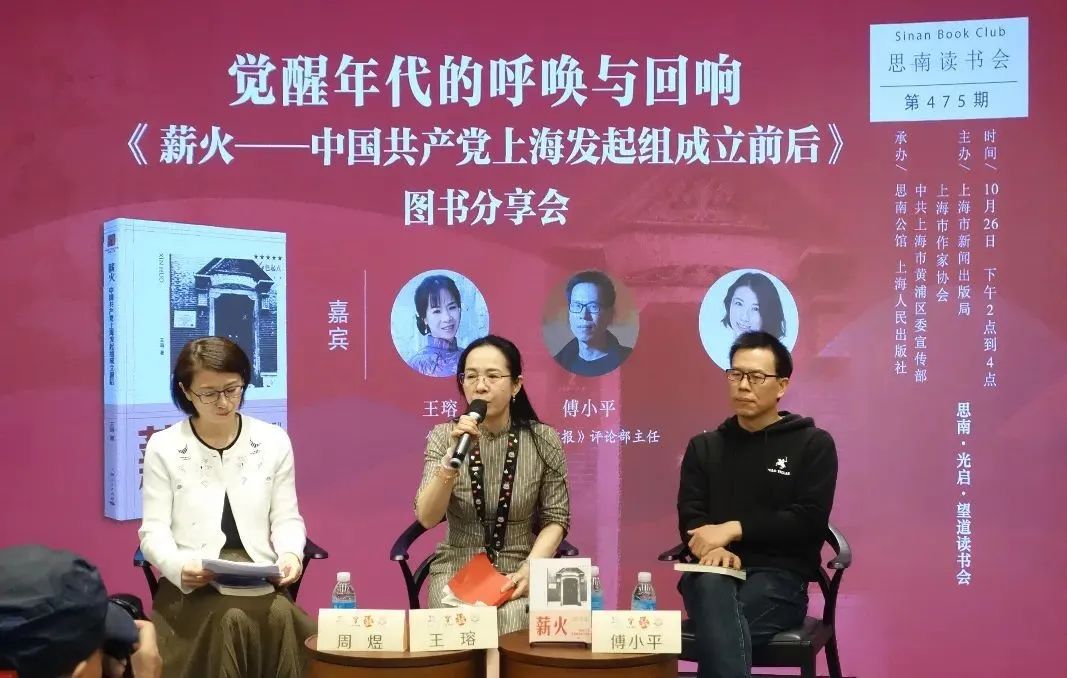 10月26日下午,作家王瑢攜其長篇紀實作品《薪火——中國共產黨上海發起組成立前后》,與評論家傅小平一起做客思南讀書會第475期,緊密圍繞中國共產黨上海發起組成立前后,以生動的人物故事書寫紛繁歷史,講述覺醒年代的青年們如何撥云睹日,點燃華夏文明之曙光。黨史研究者周煜擔任主持。