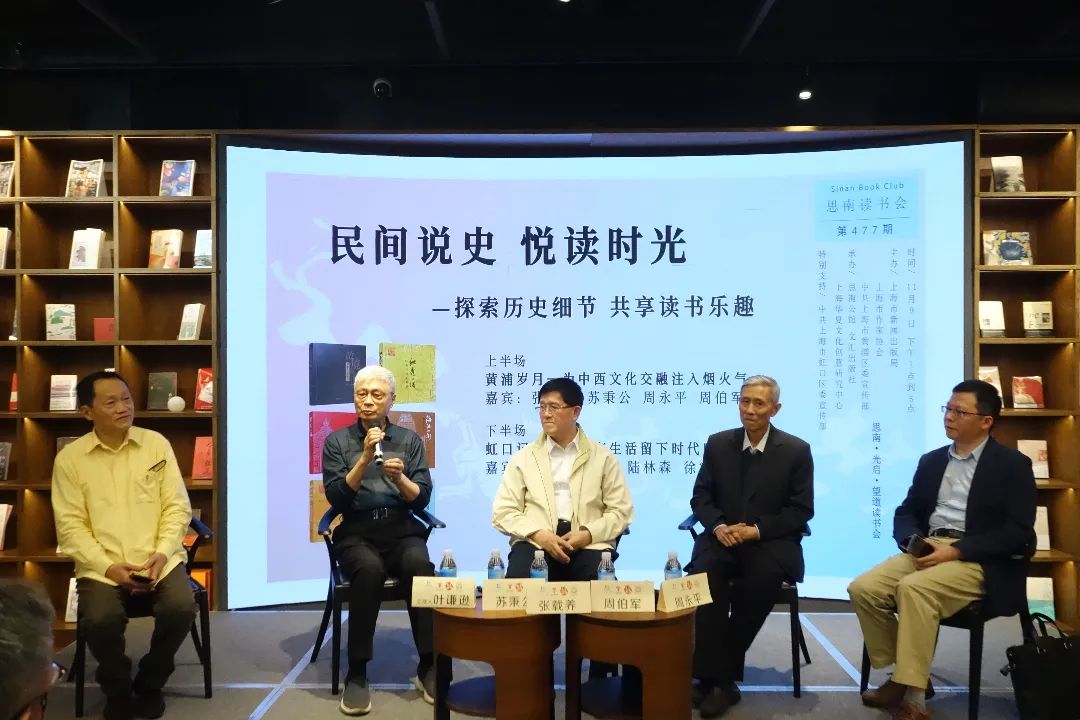 11月9日上午,上海市老干部大學藝術院副院長、《海上思南》雜志主編張載養,上海華夏文化創意研究中心名譽理事長蘇秉公,原市政府僑辦新聞文化處處長兼《上海僑報》總編輯周永平,文匯出版社社長、總編輯、編審周伯軍做客思南讀書會第477期,以“民間說史 悅讀時光——探索歷史細節”為主題,開啟一場別具一格、精彩紛呈的歷史文化之旅。葉謙遜擔任主持。