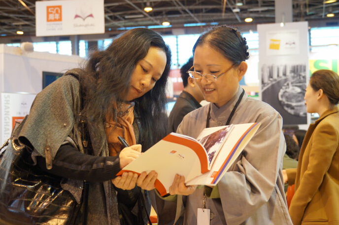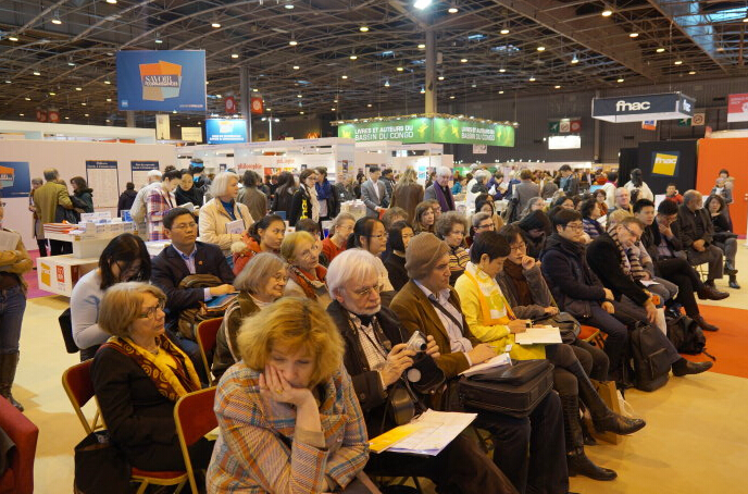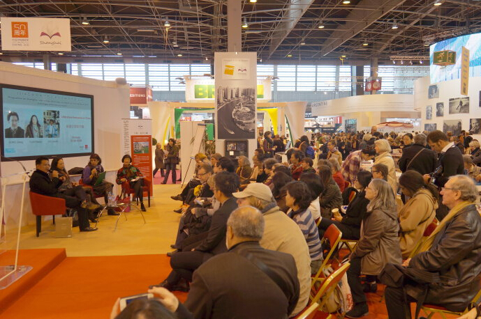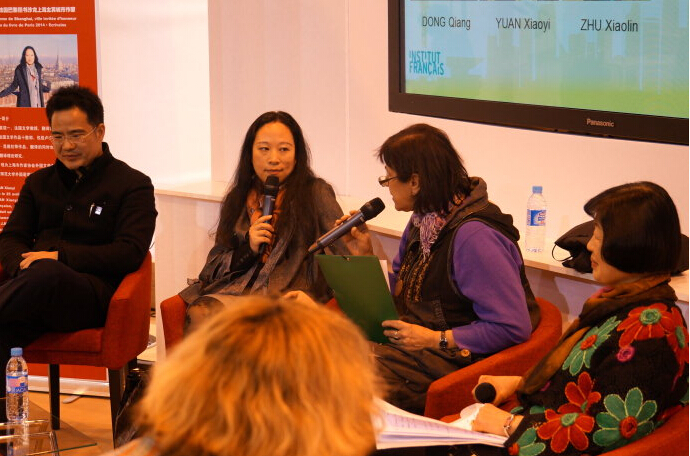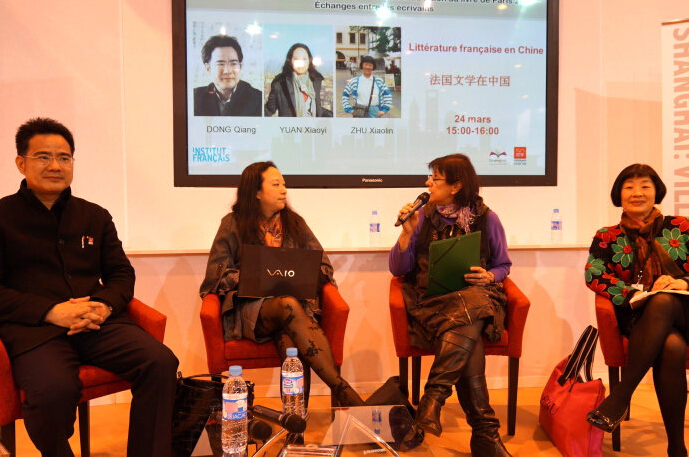2014年3月24日下午,上海作家代表團里的兩位法文專家袁筱一、朱曉琳在巴黎圖書沙龍上與董強對談《法國文學在中國》。原以為這是巴黎圖書沙龍的最后一個下午,讀者會很少,但是出乎意外的是熱情的法國讀者依然是濟濟一堂,踴躍參加。對談會還與讀者提問互動,并為讀者簽名售書。