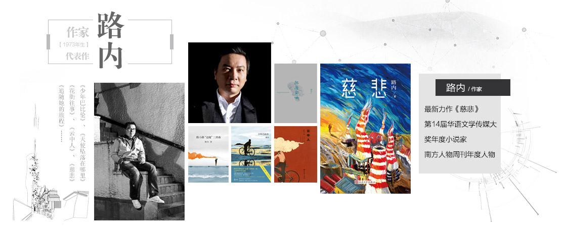 路內(nèi),1973年生,小說(shuō)家,現(xiàn)居上海,上海市作協(xié)專業(yè)作家。著有長(zhǎng)篇小說(shuō)“追隨三部曲”(包括:《少年巴比倫》、《追隨她的旅程》、《天使墜落在哪里》)、《花街往事》、《云中人》、《慈悲》,短篇小說(shuō)集《十七歲的輕騎兵》等多部作品。《少年巴比倫》參映2015年上海國(guó)際電影節(jié),入圍第28屆東京國(guó)際電影節(jié)。《紐約紐約》電影編劇。曾獲上海錦繡文學(xué)獎(jiǎng)最佳新人,人民文學(xué)首屆新人獎(jiǎng)長(zhǎng)篇小說(shuō)獎(jiǎng),第14屆華語(yǔ)文學(xué)傳媒大獎(jiǎng)年度小說(shuō)家,智族GQ年度作家,2015南方人物周刊年度魅力人物。近年唯一于《收獲》、《人民文學(xué)》連發(fā)五部長(zhǎng)篇小說(shuō)的七零后作家。