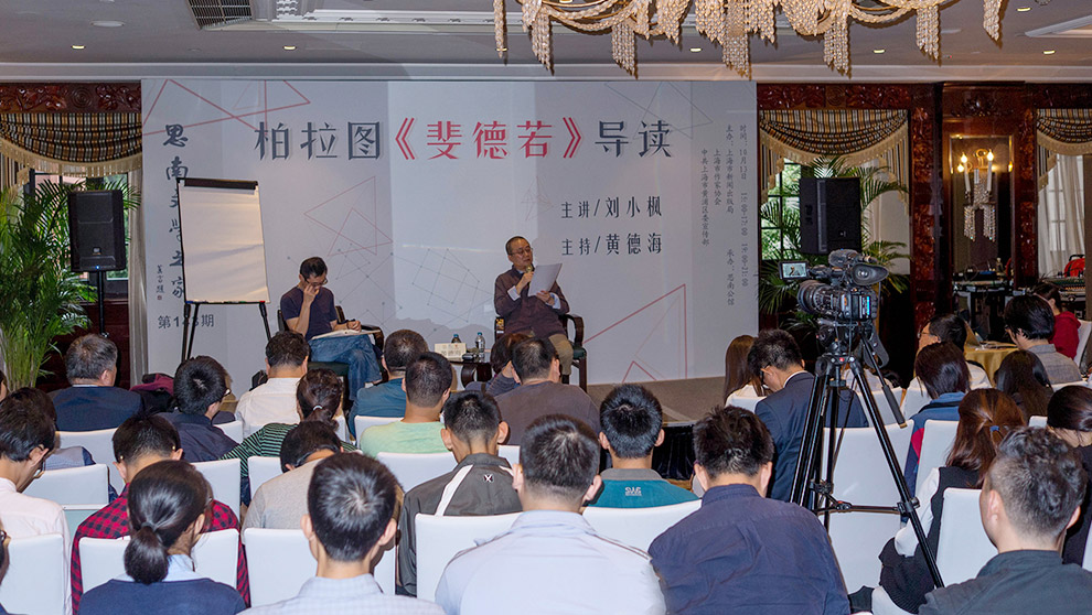 下午的講座,劉小楓介紹了《斐德若》在柏拉圖作品中的位置,并繹讀了第一篇講辭。講座中,他先是分析柏拉圖《斐德若》這部作品的結構,稱其篇幅不是很長,相當于現在說的中篇小說,大致可以分為兩個部分,第一部分是前面的三篇講辭,后面一部分是對話。他這次講座,主要分析三篇講辭中的前兩篇。