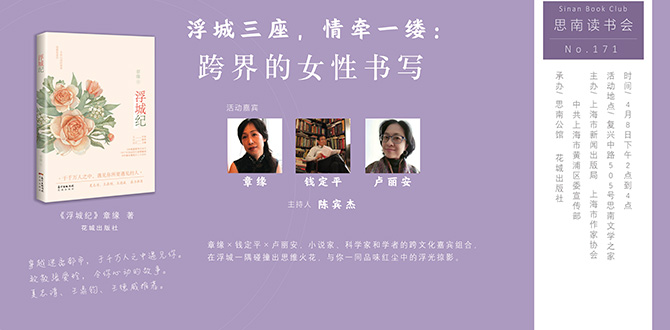 春讀書,興味長(zhǎng)。在全世界迎接閱讀日的四月,思南讀書會(huì)帶你一起閱讀小說(shuō)《浮城紀(jì)》。4月8日下午兩點(diǎn),作家章緣、電腦科學(xué)與語(yǔ)言學(xué)教授錢定平、復(fù)旦大學(xué)外國(guó)語(yǔ)言文學(xué)學(xué)院副院長(zhǎng)兼英文系教授盧麗安做客第171期思南讀書會(huì),三位跨界嘉賓以小說(shuō)《浮城紀(jì)》為中心展開(kāi)對(duì)談,從不同視角分享這部作品的創(chuàng)作背景、閱讀感受。側(cè)耳聲音團(tuán)隊(duì)印海蓉、徐惟杰、李菡現(xiàn)場(chǎng)朗誦《浮城紀(jì)》片段。
