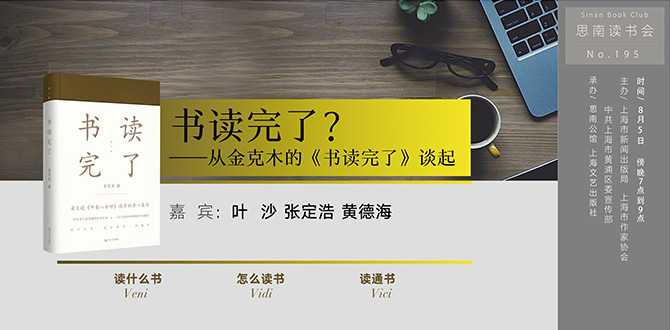 8月5日,《子夜書社》的主持人葉沙,《書讀完了》的編者、《思南文學選刊》副主編黃德海,《上海文化》雜志副主編張定浩共同做客第195期思南讀書會。三位嘉賓帶著對金克木老先生的敬意,對其作《書讀完了》進行滲透式解析,與現場讀者們一同分享文化大家金克木其人、其事及讀書的方法。