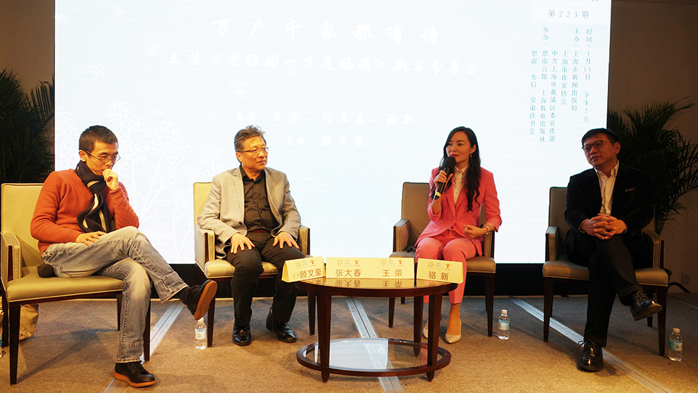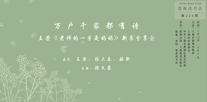 1月13日,《詩書中華》人氣選手、滬上青年語文高級教師王榮攜其新書《老師的一半是媽媽》與臺灣作家張大春、電視主持人駱新共同做客第223期思南讀書會,文化評論人顧文豪擔(dān)任主持,共同探討詩歌觀照下教學(xué)相長與親子互動的“雅事”。