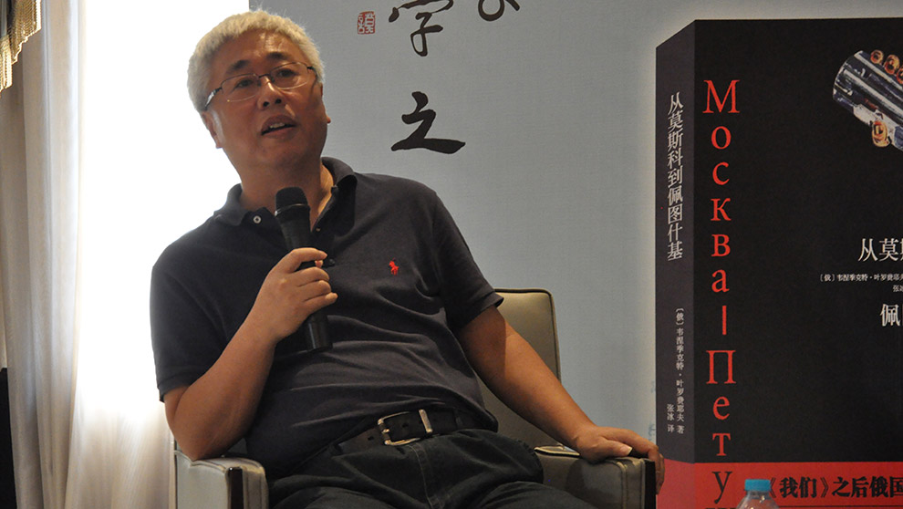 鄭體武教授先從知人論世的角度,簡(jiǎn)單介紹了葉羅費(fèi)耶夫生平及其作品《從莫斯科到佩圖什基》。他還拿來(lái)本世紀(jì)初俄羅斯出版的一本《從莫斯科到佩圖什基》的注釋版,“原文僅105頁(yè),而注釋篇幅竟長(zhǎng)達(dá)400多頁(yè)。”他解釋道,全書看似醉酒的語(yǔ)言中,盡是典故、隱射,涉及到的俄國(guó)各時(shí)期作家就有五十個(gè)左右,更有俗語(yǔ)、黑話,甚至還有臟話,中文版引進(jìn)時(shí)已經(jīng)做了相應(yīng)的處理。